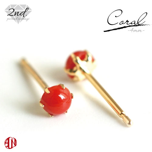 【A.UN jewelry】◆セカンドピアス◆ コーラル ≪直径約4mm≫ K18 YG / カボション ピアス / 軸太 0.9mm 軸長さ 12mm つけっぱなし スタッドピアス made in japan イタリア産 サンゴ 珊瑚 coral / K18YGシリコンダブルキャッチ付き♪ / 両耳用