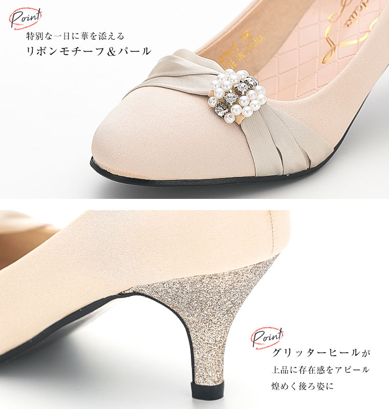 結婚式 パンプス 靴 美脚 ローヒール 疲れない 大きいサイズ 5センチヒール 6センチヒール ミドルヒール 22.5 23 23.5 24 24.5 リボンパンプス ビジュー パール ベージュ ブラック 黒 二次会 パーティー お呼ばれ 謝恩会 演奏会 成人式 同窓会 オケージョン 送料無料